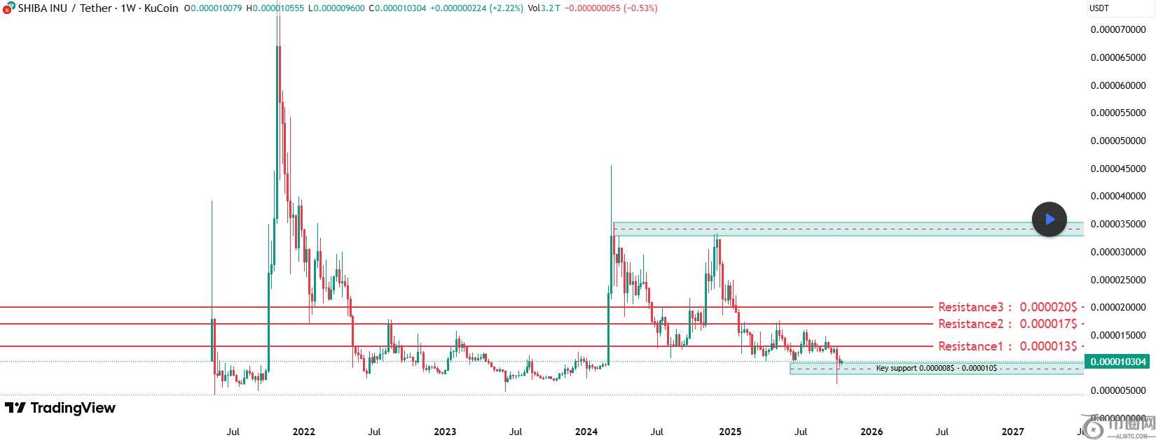 柴犬在其长期积累阶段持续进行之际,其在当前支撑位 0.000006 美元至 0.000010 美元附近保持强劲。值得注意的是,自 2021 年大牛市结束后回调至该区域以来,该需求区域已多次缓冲看跌势头。
