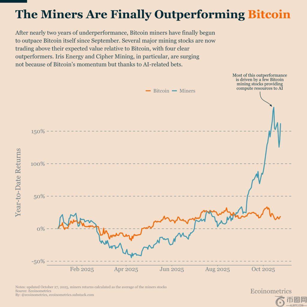 那么,为什么比特币矿工的表现会超过比特币本身呢?原因很简单:世界突然意识到,矿工不仅仅是加密货币投机者。他们是数字经济的守门人,有望为人工智能、去中心化计算,以及可能还有下一波可持续工业能源提供基础设施。