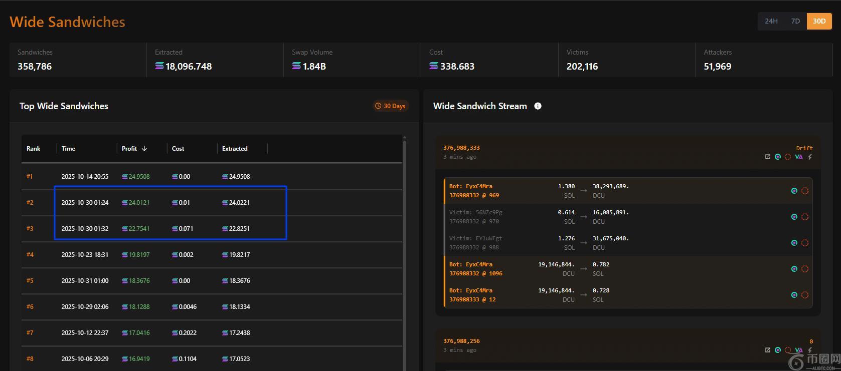 就在昨天,10 月 30 日,两个机器人仅花费不到 0.1 SOL 就通过三明治攻击获得了超过 46 SOL 的收益。