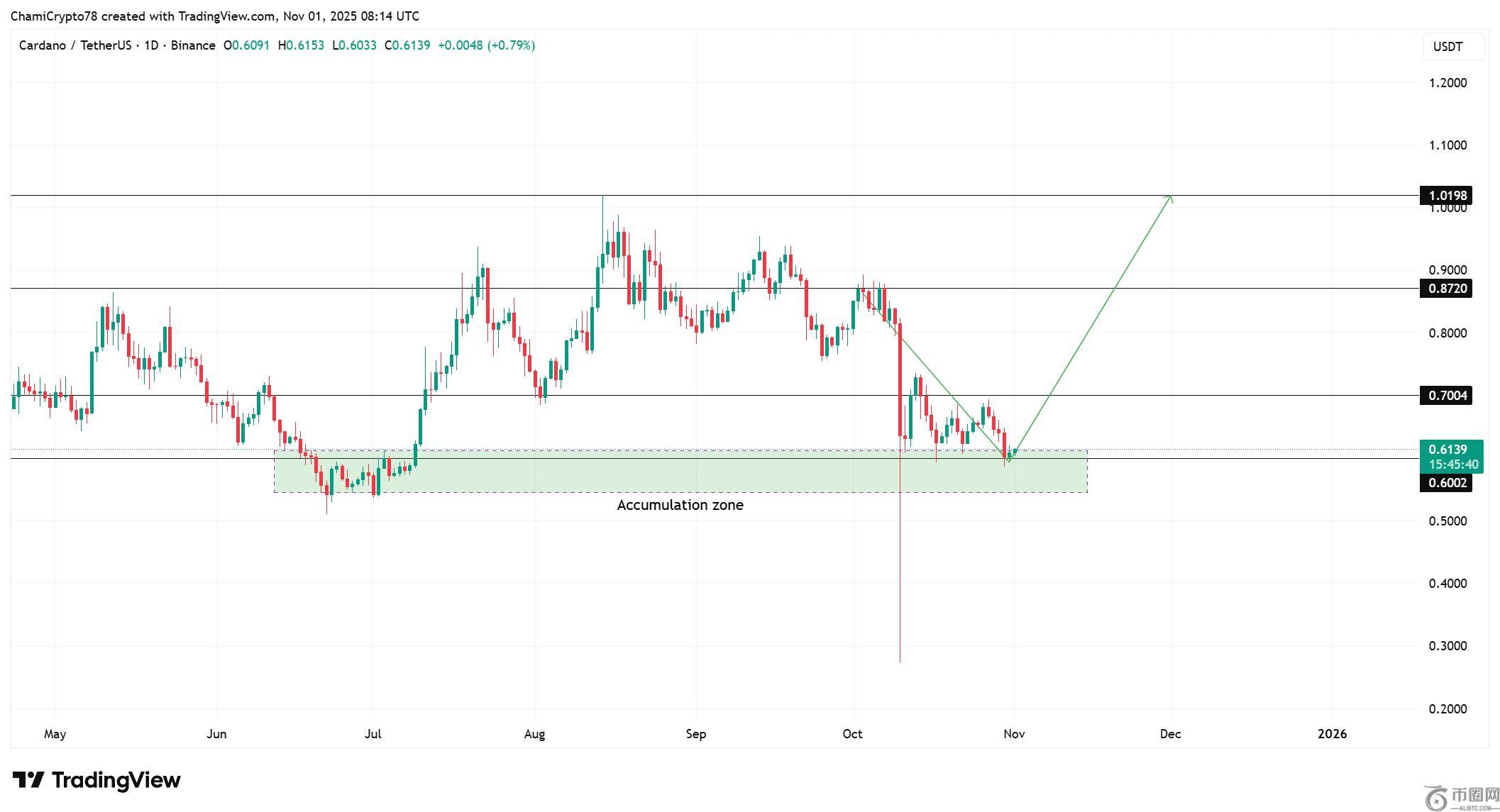 Cardano 的价格在 0.60 美元到 0.62 美元之间紧密盘整,这是一个明确的积累区,表明买家的强力防御。