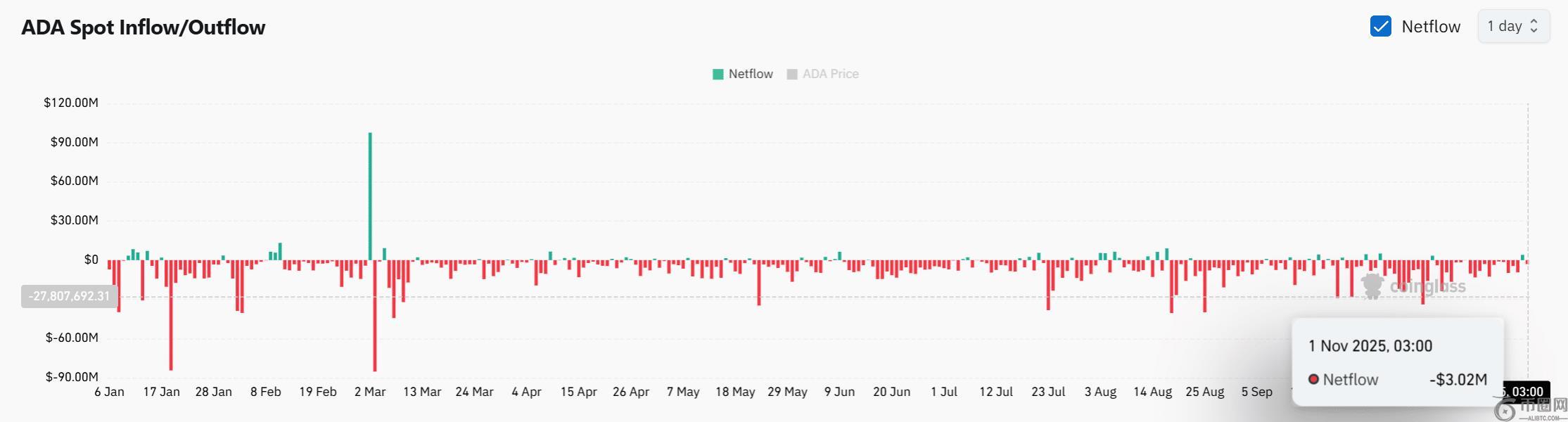 Cardano 的链上行为进一步证实了其活跃度的上升。交易所数据显示,净流入持续为负,最新读数为 -302 万美元,证实了巨鲸正在将资产转移出交易所。