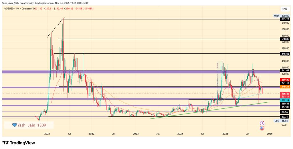 关键支撑位在 150 美元至 160 美元区间,与自 2023 年以来一直保持的长期上升趋势线相吻合。如果该水平守住,AAVE 价格兑美元汇率可能反转,并有望在短期内上涨至 240 美元,短期内甚至可能达到 341 美元。若能有效突破 341 美元,则有望在年底前上涨至 446 美元至 538 美元。