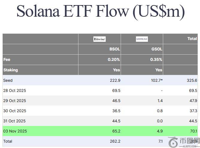 自10月28日推出以来,该投资工具已累计吸引资金流入2.69亿美元。值得注意的是,Bitwise旗下的BSOL是该投资工具推出以来资金流入最多的品种。