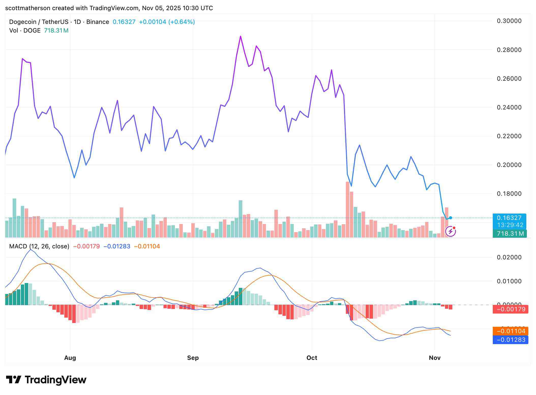 截至目前,狗狗币的市值在过去七天内已从近300亿美元跌至约247亿美元。交易量在过去24小时内也大幅飙升,其中大部分为抛售。