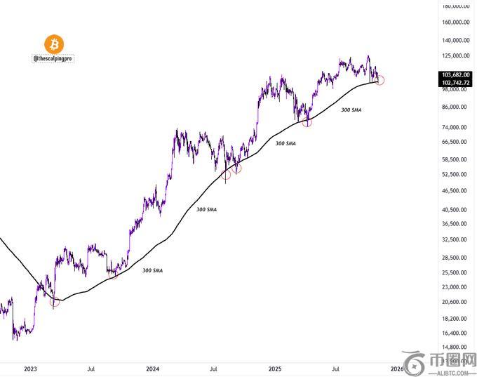 放大观察比特币日线图,自 2023 年初以来,300 日移动平均线已多次起到支撑作用。