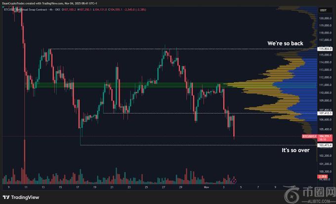 根据 Daan Crypto Trades 的分析,BTC/USD 价格图表清楚地显示,曾经稳定的底部 106,000 美元至 107,000 美元区域现在已经跌破。