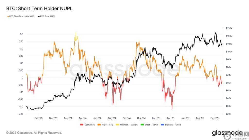 根据 Glassnode 上的链上数据,短期持有者的净未实现利润/亏损 (NUPL) 指标已滑入“投降”区域。