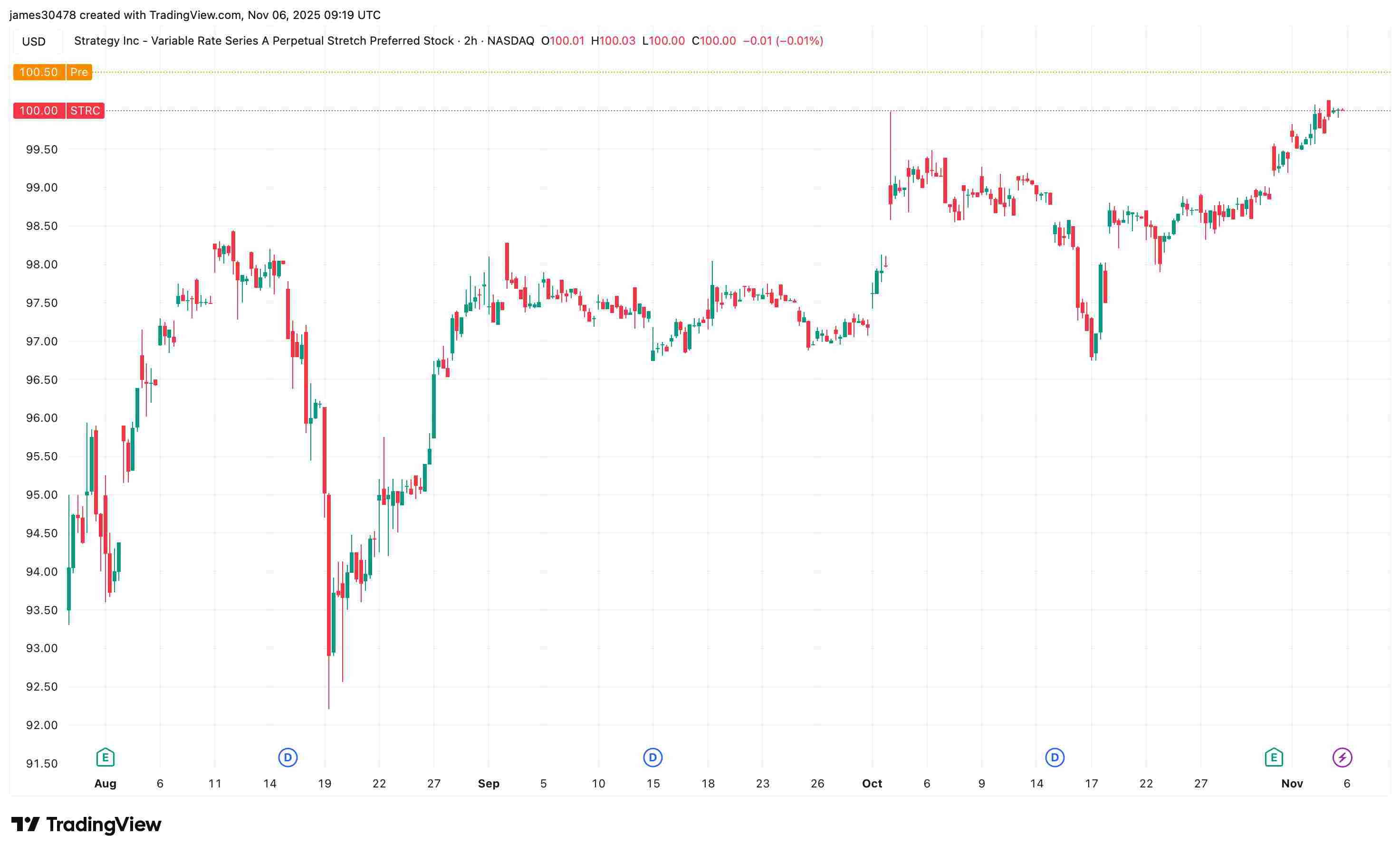 STRC 盘前交易上涨 0.5%,至每股 100.50 美元,而 MSTR 下跌 1%。