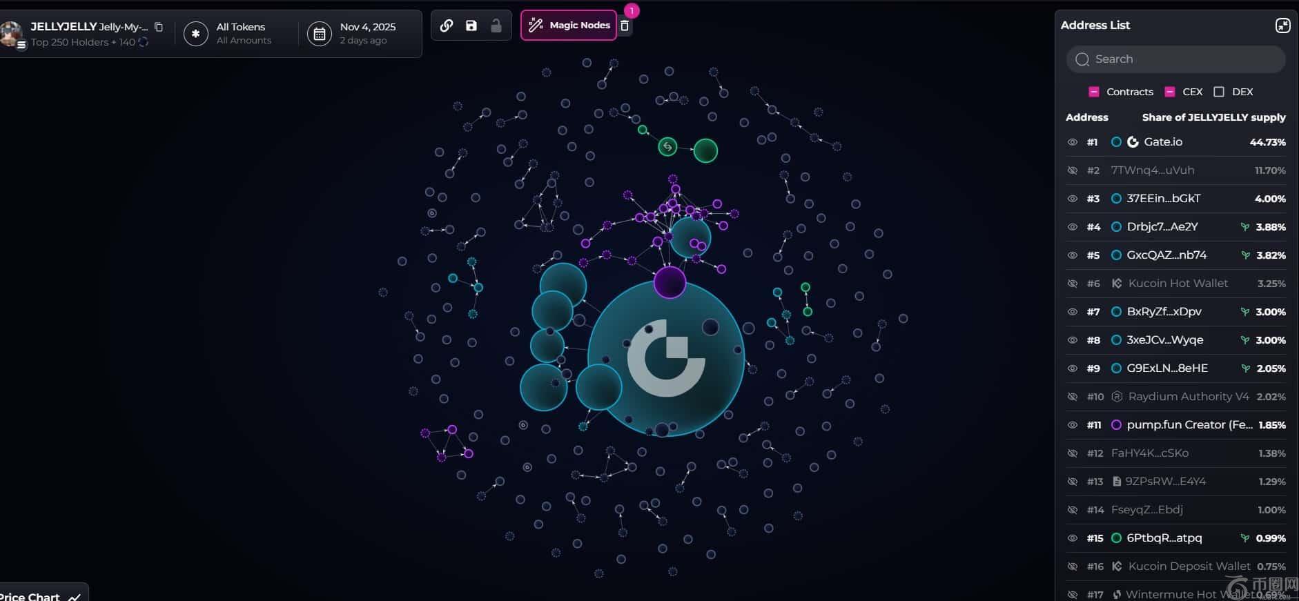 据分析平台 Bubblemaps 指出,自 2025 年 10 月下旬以来,有 7 个不活跃的钱包从 Gate.io 和 Bitget 提取了超过 20% 的模因币供应量。