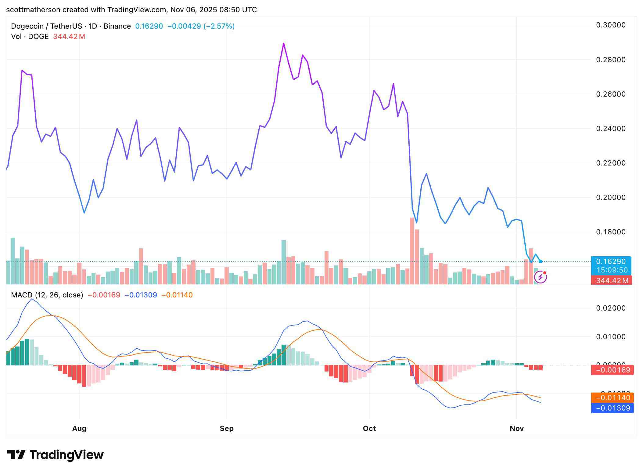 截至发稿时,狗狗币价格约为 0.16 美元,在过去 24 小时内有所下跌。数据来自 CoinMarketCap。