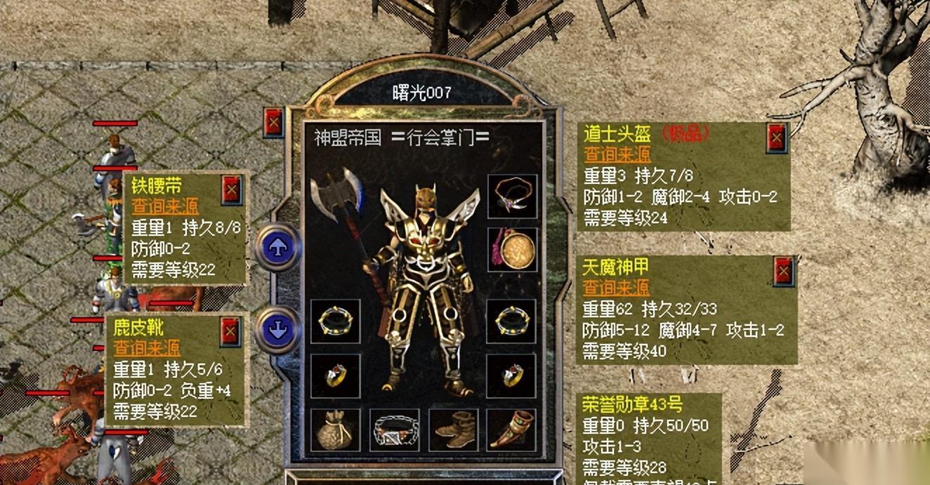 目前新百区大多数运九套玩家能搭配铁腰带和鹿皮靴已经很不错了,此外,这位战士还有天魔神甲和攻3荣誉勋章这种顶级战士道具。至于那顶道士头盔比较稀有,它多加了1点魔御属性上限和2点攻击属性,这都是团战中战士需要的属性,确实不错。
