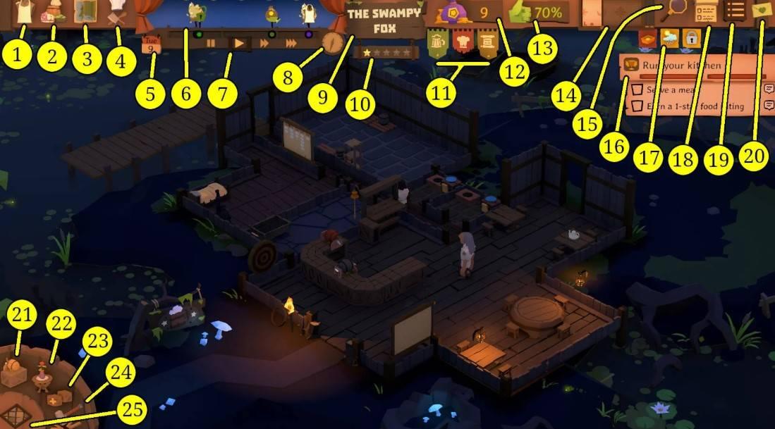 玩家将从一个空荡荡的、破败的小酒馆和几百金币开始。与所有新酒馆一样,您将获得“基础”目标,其中列出了以下内容: