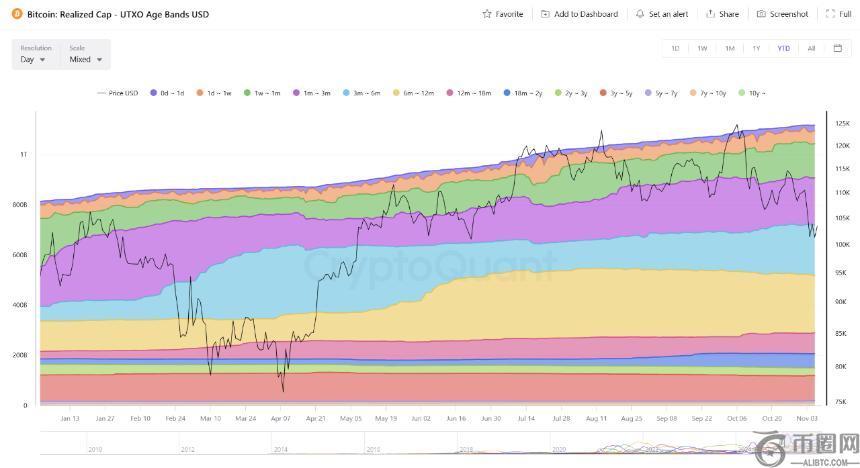 另一方面,链上数据显示,代币所有权正从弱势投资者向强势投资者转移。UTXO 年龄区间显示,持有超过三年的代币目前占据了已实现价值的主导地位,而短期持有的代币则大幅下降。这种模式与 2019 年和 2020 年周期底部的情况一致。