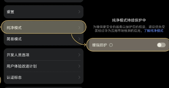 1. 进入【设置】→【系统和更新】→【纯净模式】,关闭【增强防护】功能