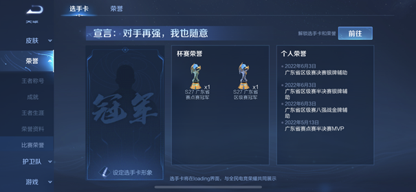1)当玩家本赛季在全国大赛本赛季达到对应级别的冠军并进行选手认证后,可依次解锁获得对应的荣誉展示及使用——冠军选手卡,冠军表情,区级冠军天幕,区级冠军称号和省级选手空间装扮,玩家可以根据自身的情况进行设置。