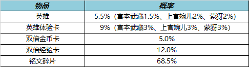 打开后可随机获得以下奖励之一:宫本武藏、上官婉儿、蒙犽、英雄体验卡3天、双倍金币卡:1日、双倍经验卡:1日、188/138/108铭文碎片。