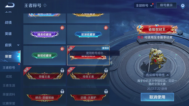 2)同时,当前赛季参与全国大赛并获得多次冠军的选手,将获得“多冠王”的传说称号,以双冠王为例,荣誉界面示意图如下: