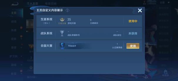 3)为了便于玩家记录在全国大赛的参与情况,在个人主页新增选手认证印记可供玩家自定义展示,设置如下: